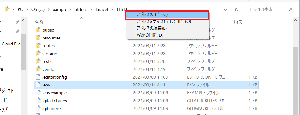 まずは「laravel」が存在するフォルダのアドレスをコピーします。