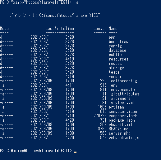 次に「laravel」のフォルダに移動します。コマンドに慣れていない人のため(つまり自分の為)に、ディレクトリに移動する方法を記述します。