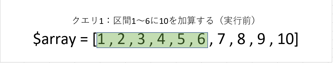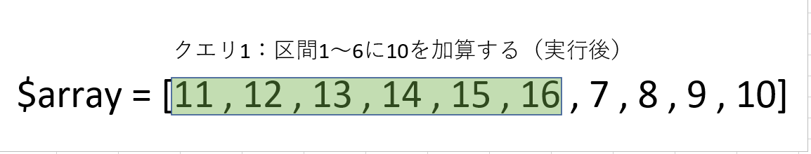 1回目のクエリを見てみると「1 6 10」となっており、区間1~6番目、すなわち「配列のインデックスキー0~5の要素に10を加算しなさい」という意味になります。