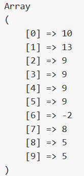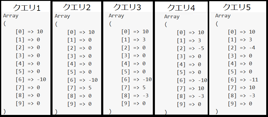 まずこの場合、配列の要素数が「10」、クエリ数「5」、配列は「$array = [1,2,3,4,5,6,7,8,9,10]」が用意されており、合計5回のクエリを実行することで答えを出力します。
