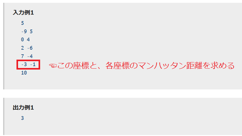 二点の距離をマンハッタン距離で求める問題ですが、一点はまぁn個座標が与えられているから分かりやすいのですが、基準となる座標が分かりにくすぎる。