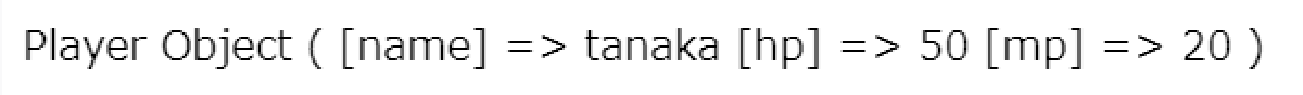 <?php class Player { //クラスを宣言 public $name; //「name」変数を宣言 public $hp; //「hp」変数を宣言 public $mp; //「mp」変数を宣言 } $tanaka = new Player(); //「Player」クラスから「$tanaka」オブジェクトを作成 print_r($tanaka); //確認用 ?> |