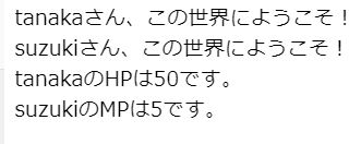 <?php class Player { //クラスを宣言 public $name; //「name」変数を宣言 public $hp; //「hp」変数を宣言 public $mp; //「mp」変数を宣言 public function __construct($name , $hp , $mp){ //コンストラクタ(インスタンス化した際の初期値入力設定) $this->name = $name; //作成するオブジェクトの「name」項目に変数「$a」を代入する $this->hp = $hp; //作成するオブジェクトの「hp」項目に変数「$b」を代入する $this->mp = $mp; //作成するオブジェクトの「name」項目に変数「$c」を代入する echo $this->name."さん、この世界にようこそ!<br>"; } public function denote_hp(){ //プレイヤーのHPを表示するメソッド echo $this->name."のHPは".$this->hp."です。<br>"; } public function denote_mp(){ //プレイヤーのMPを表示するメソッド echo $this->name."のMPは".$this->mp."です。<br>"; } } $tanaka = new Player("tanaka" , 50 , 20); //「Player」クラスから「$tanaka」オブジェクトを作成し、各項目に初期値を設定する $suzuki = new Player("suzuki" , 75 , 5); //「Player」クラスから「$suzuki」オブジェクトを作成し、各項目に初期値を設定する $tanaka->denote_hp(); //「$tanaka」のHPを表示する $suzuki->denote_mp(); //「$suzuki」のMPを表示する ?> |