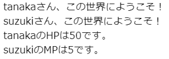 <?php class Player { //クラスを宣言 public $name; //「name」変数を宣言 public $hp; //「hp」変数を宣言 public $mp; //「mp」変数を宣言 public function __construct($name , $hp , $mp){ //コンストラクタ(インスタンス化した際の初期値入力設定) $this->name = $name; //作成するオブジェクトの「name」項目に変数「$a」を代入する $this->hp = $hp; //作成するオブジェクトの「hp」項目に変数「$b」を代入する $this->mp = $mp; //作成するオブジェクトの「name」項目に変数「$c」を代入する echo $this->name."さん、この世界にようこそ!<br>"; } public function denote_hp(){ //プレイヤーのHPを表示するメソッド echo $this->name."のHPは".$this->hp."です。<br>"; } public function denote_mp(){ //プレイヤーのMPを表示するメソッド echo $this->name."のMPは".$this->mp."です。<br>"; } } $tanaka = new Player("tanaka" , 50 , 20); //「Player」クラスから「$tanaka」オブジェクトを作成し、各項目に初期値を設定する $suzuki = new Player("suzuki" , 75 , 5); //「Player」クラスから「$suzuki」オブジェクトを作成し、各項目に初期値を設定する $tanaka->denote_hp(); //「$tanaka」のHPを表示する $suzuki->denote_mp(); //「$suzuki」のMPを表示する ?> |