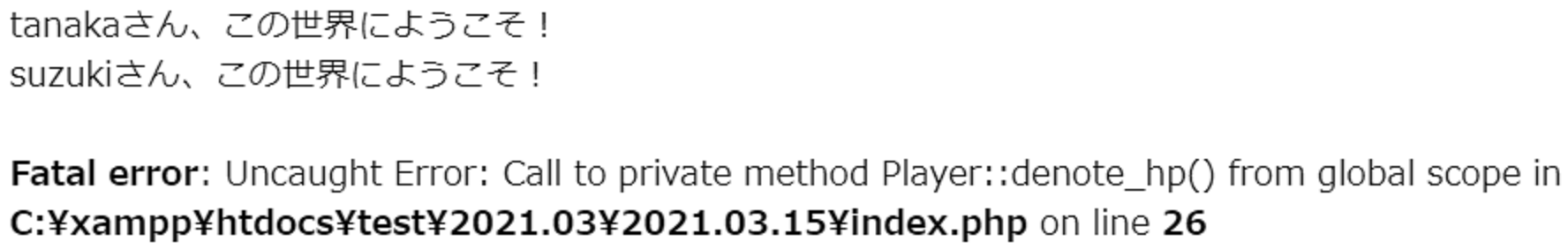 外部から、メソッド「public function denote_hp_pub();」と「public function denote_mp_pub();」を呼び出してみます。実行結果は下記画像の通です。