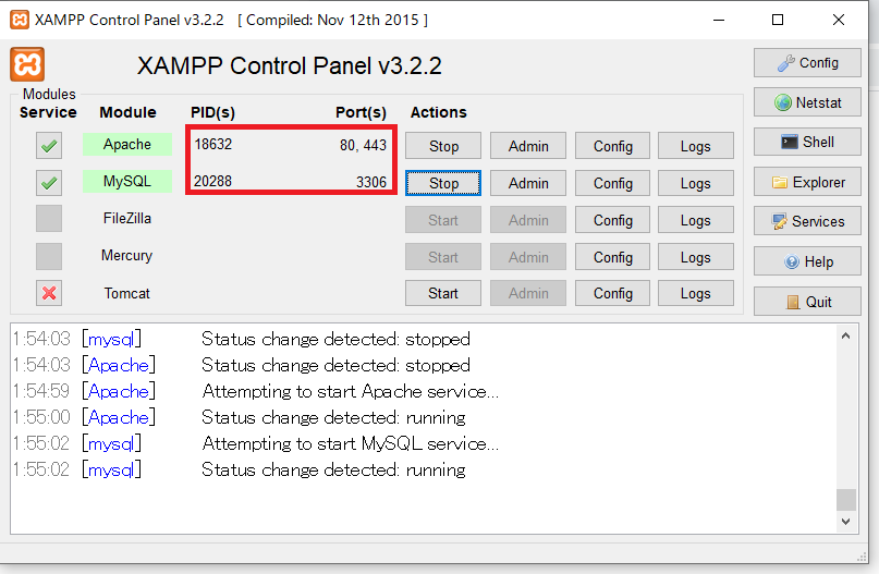 ApacheとMySQLの「Start」ボタンを押します。実は単にPHPの動作を確認するだけならApacheの起動だけでいいのですが、MySQLもセットで起動しておいても問題はないでしょう。