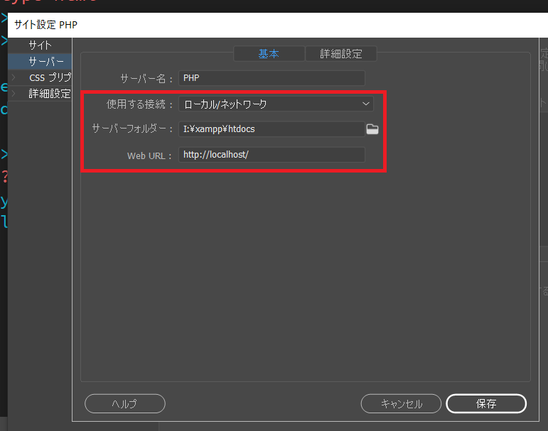 「ローカルサイトフォルダー」は「Xampp」フォルダ内にある「htdocs」フォルダを選択します。