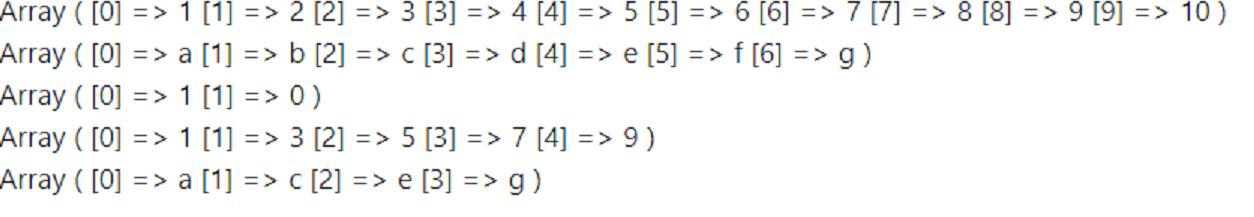 <?php //range(開始の値 , 終了の値 [, スキップする数 ]); $array1 = range(1 , 10); $array2 = range("a" , "g"); $array3 = range(1 , "a"); $array4 = range(1 , 10 , 2); $array5 = range("a" , "g" , 2); print_r($array1);echo "<br>"; print_r($array2);echo "<br>"; print_r($array3);echo "<br>"; print_r($array4);echo "<br>"; print_r($array5);echo "<br>"; ?> |