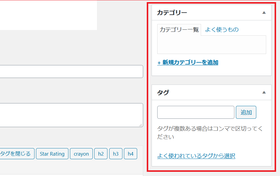 使い方はというと記事作成のカテゴリーやタグの挿入と一緒で、新しくカテゴリーを作りたい場合は「+新規カテゴリーを追加」をクリックしてカテゴリーを作ります。既に必要なカテゴリーがある場合は、「カテゴリー一覧」や「よく使うもの」から選択します。