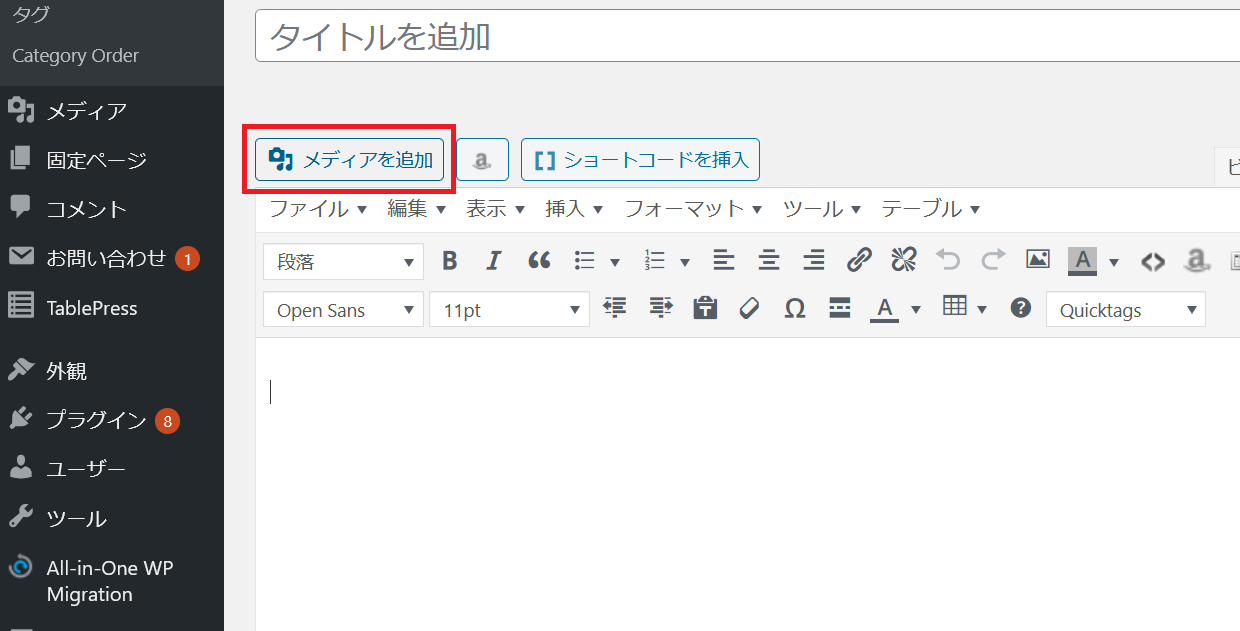 まずは記事中に画像を挿入したいので、「メディアを追加」ボタンを押します。