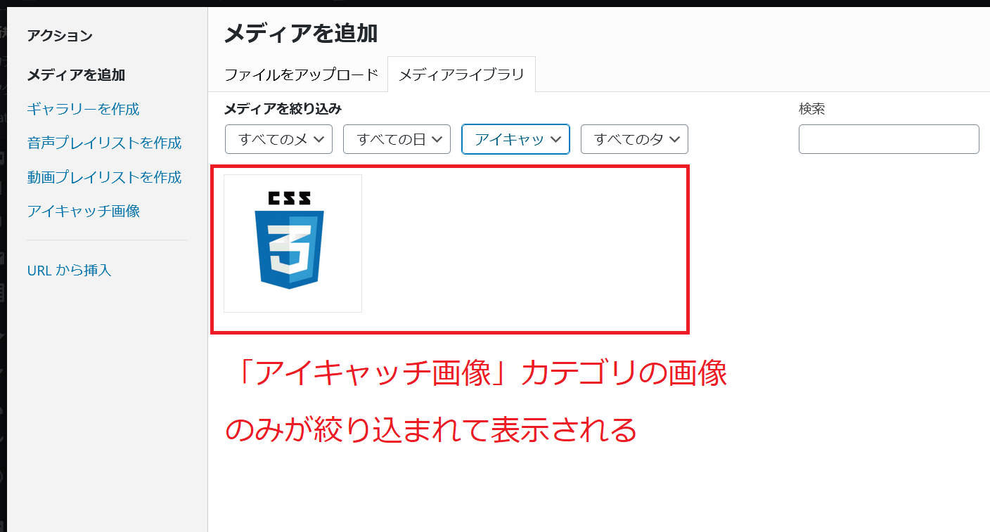 今回私が使った画像は上図のようにカテゴリーを「アイキャッチ画像」、タグに「css、アイキャッチ、アイキャッチ画像」という単語を登録しました。この情報をもとに、記事作成中にこの画像を絞り込み検索から挿入してみたいと思います。
